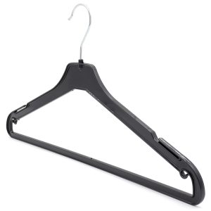 - Trouser Bar – This adult plastic suit hanger has a built-in trouser bar, enabling the hanging of trousers, bottoms, and other items.