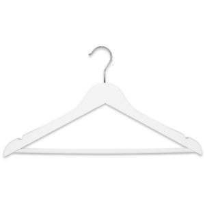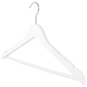 - Multi-Purpose – This is a versatile adult hanger, with notches and trouser bar, for ladies’ and men’s clothing. So, it’s the perfect white wooden hanger for trousers as well as suits, shirts, jackets and coats. Also for dresses, skirts and jumpers.