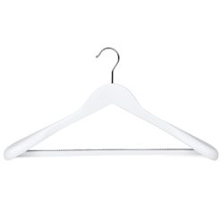 - Speciality Hanger – At 45cm, this strong adult white wooden broad-ended hanger is designed for storing suits and heavy items such as coats and jackets.
